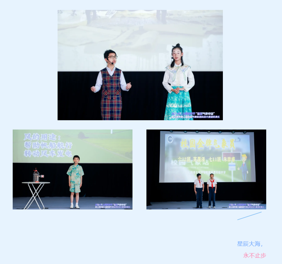 万物生长,气象万千,年幼的心灵如何揭开这天空秘语?气象主播秀的舞台上,创意与才华在这里碰撞。小选手们通过生动的语言、多样的实验道具、精美的PPT、酷炫的多媒体动画特效,将极光和火烧云的绚烂、冰雹的凌厉、雷电的狂怒、龙卷风的肆虐等天气现象一一展现。还有的结合个人兴趣和热点话题,介绍起盘古气象大模型、古诗里的二十四节气知识、花期预报等气象知识,绽放小小气象主播的亮丽风采。
