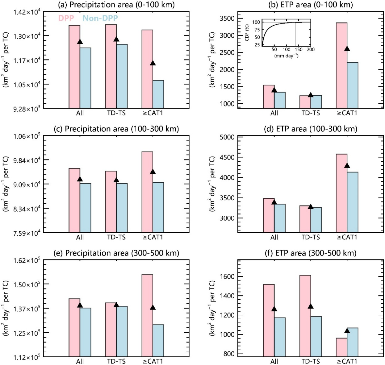 图3 所有TC(ALL)、弱TC(TD-TS)和强TC(≥ CAT1)陆地降水面积(降水率>1mm/day)和极端降水面积(降水率大于139mm/day;前5%):(a-b)0-100 km、(c-d)100-300 km、(e-f)300-500 km