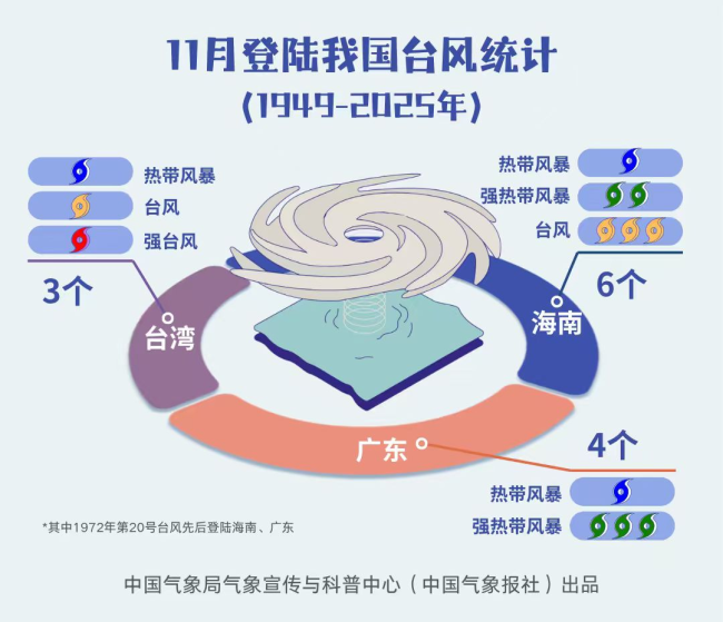 中央气象台1949年至2025年的统计数据显示,11月共有12个台风登陆我国,登陆地集中在海南、广东和台湾。而最晚登陆我国的台风为2004年第28号台风“南玛都”,于12月4日登陆我国台湾省屏东县。